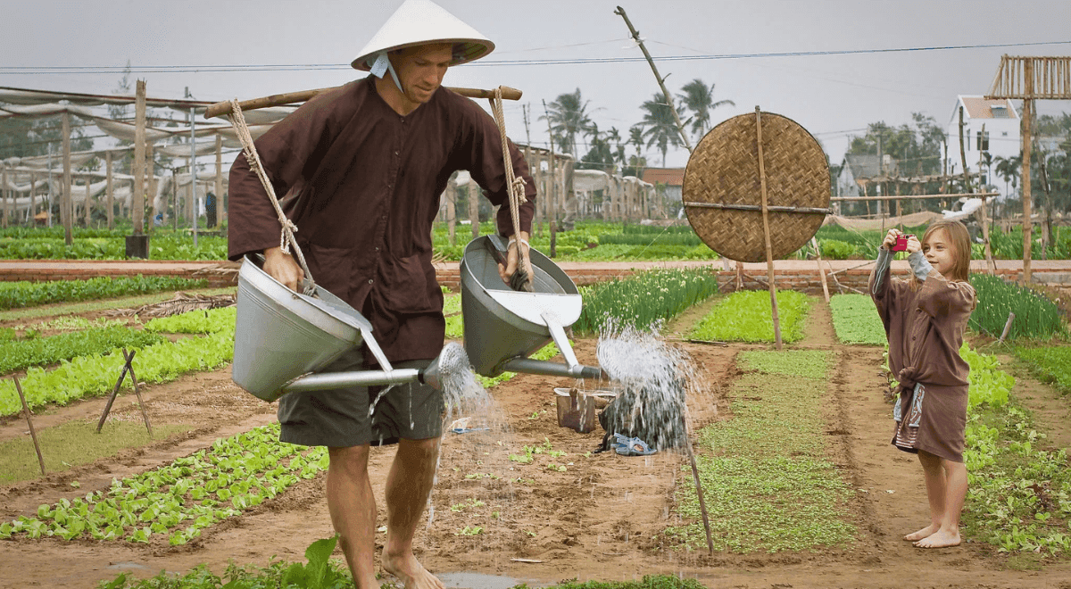 Balade à vélo à travers les vergers tropicaux et de jardins fleuris. Initiation à la préparation d’un gâteau traditionnel à la banane, puis promenade à vélo autour de l’île jusqu’au célèbre pont de singe, passerelle typique utilisée quotidiennement par les habitants pour traverser les canaux. Arrêt chez un agriculteur local pour savourer une tasse de thé ou de l’eau de coco fraîche. Possibilité de cueillir quelques fruits dans le jardin et d’échanger avec votre hôte afin de mieux comprendre la vie quotidienne et le travail des cultivateurs du delta.