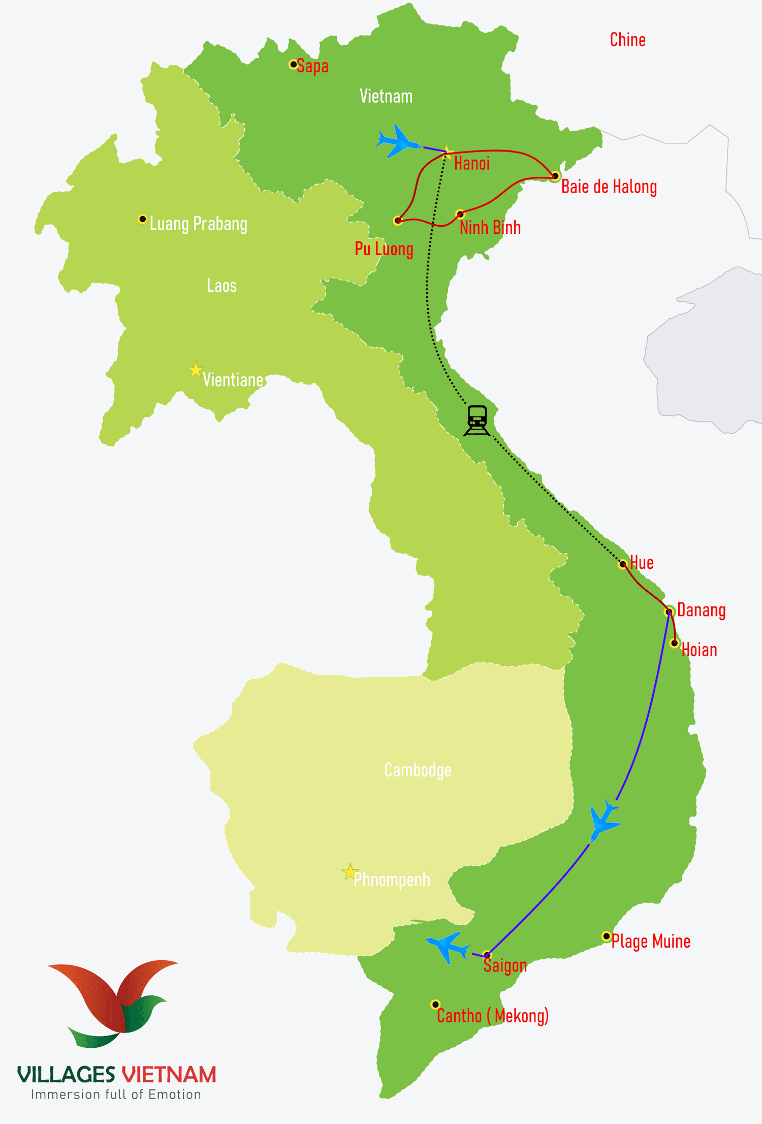 Ho Chi Minh VilleBen Tre - Delta du MékongCan Tho - Delta du MékongHoi AnMy sonAncienne capitale HueBaie de Lan HaGrotte Phong NhaNinh Binh - Baie d'Halong terrestreBaie de HalongCapitale de Hanoi