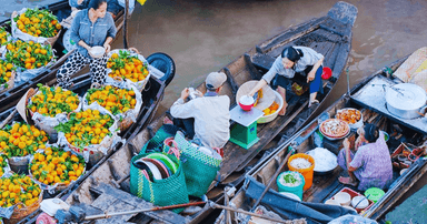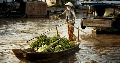 Après votre agréable petit déjeuner, rembarquement sur un petit bateau puis promenade matinale en bateau jusqu’au marché flottant de Cai Rang, le plus grand marché flottant du delta, spectacle étonnant que cette myriade de barques qui chaque matin se présente autour de coques ventrues débordant de bananes, de riz, de mangues , d’ananas…