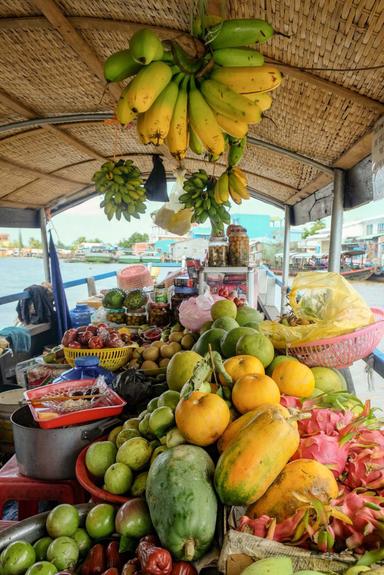 Observation de la vie commerciale sur l’eau : fruits, légumes, poissons et produits agricoles du Mékong