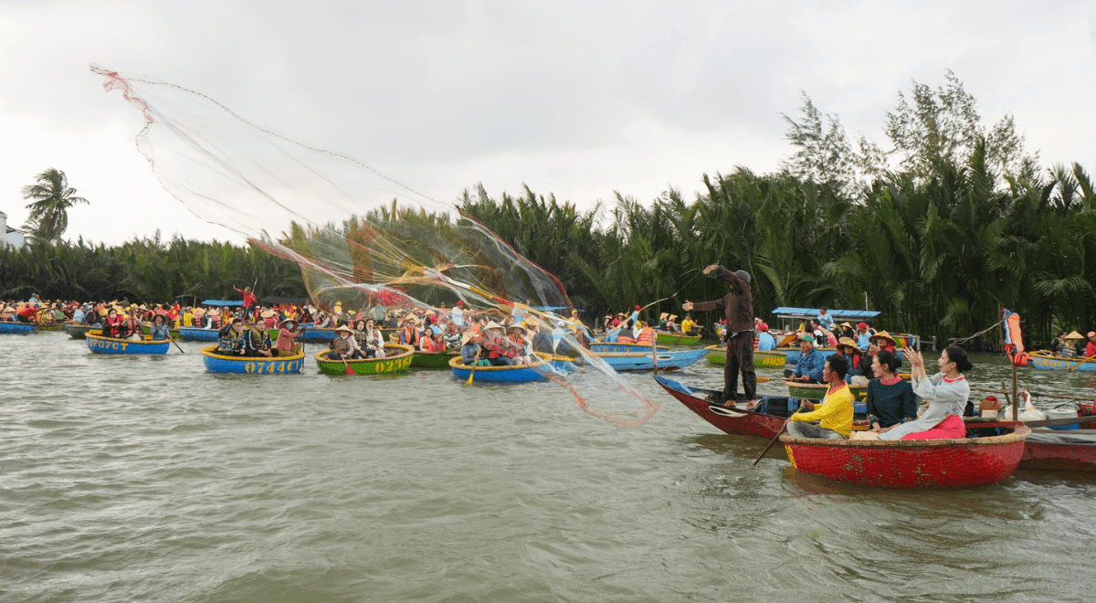 Arrivée au village de Cam Thanh pour une expérience ludique en bateau-panier à travers la forêt de cocotiers d’eau. Participation aux activités de pêche traditionnelles avec les habitants.